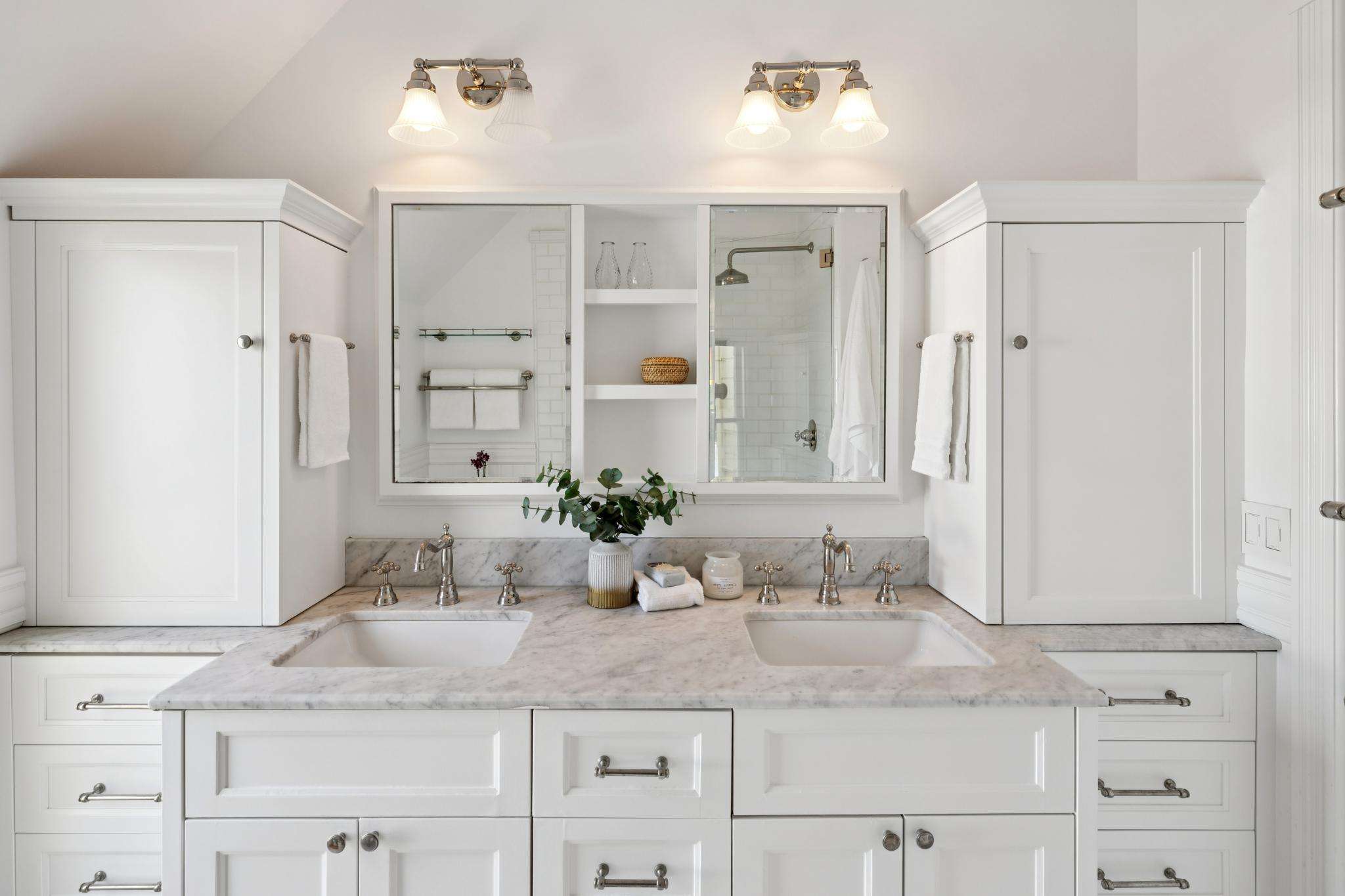 Two separate staircases lead up to four additional bedrooms (including a massive primary suite), a spa-like bathroom and three storage closets on the top floor.